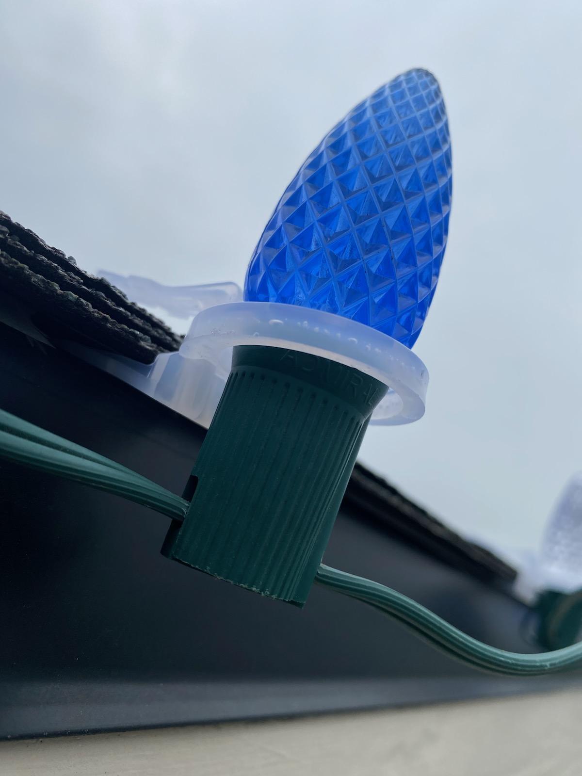 Plastic clip designed to secure Christmas light bulbs with e17 base and socket wire to gutters and asphalt shingles. Perfect for installing Christmas Lights on most houses.