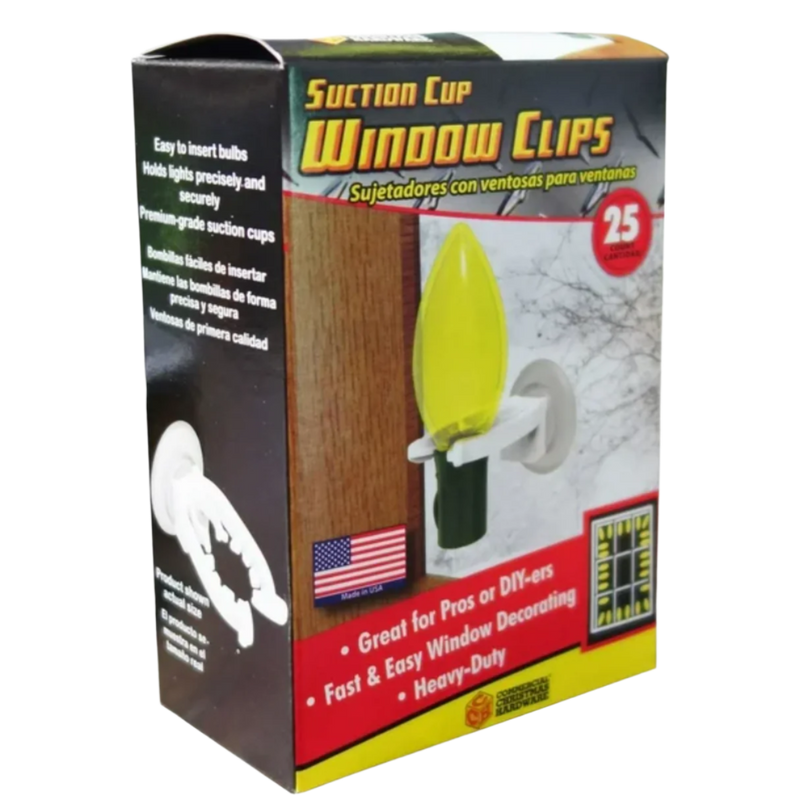 Designed for both indoor and outdoor use, these heavy-duty window clips make decorating quick and effortless. The precision-fit design securely holds bulbs of all sizes, ensuring clean, consistent placement. Each clip features a premium-grade suction cup that resists yellowing, deterioration, and loss of adhesion over time—providing long-lasting performance through the seasons.