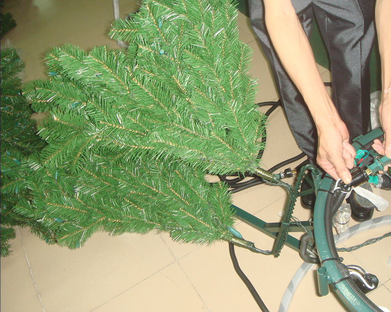 The metal frame can be bolted together and stacked for taller applications. Electrical connections can be concealed inside the hollow frame for the light wrapped garland branches, which can be easily hung after metal frame is constructed.